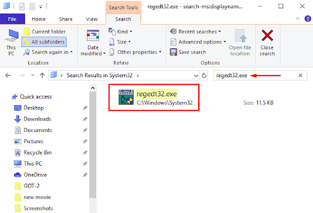 The last way is to search for it manually. Open Explorer and navigate to the path C:\Windows\System32\, then locate the regedt32 file.